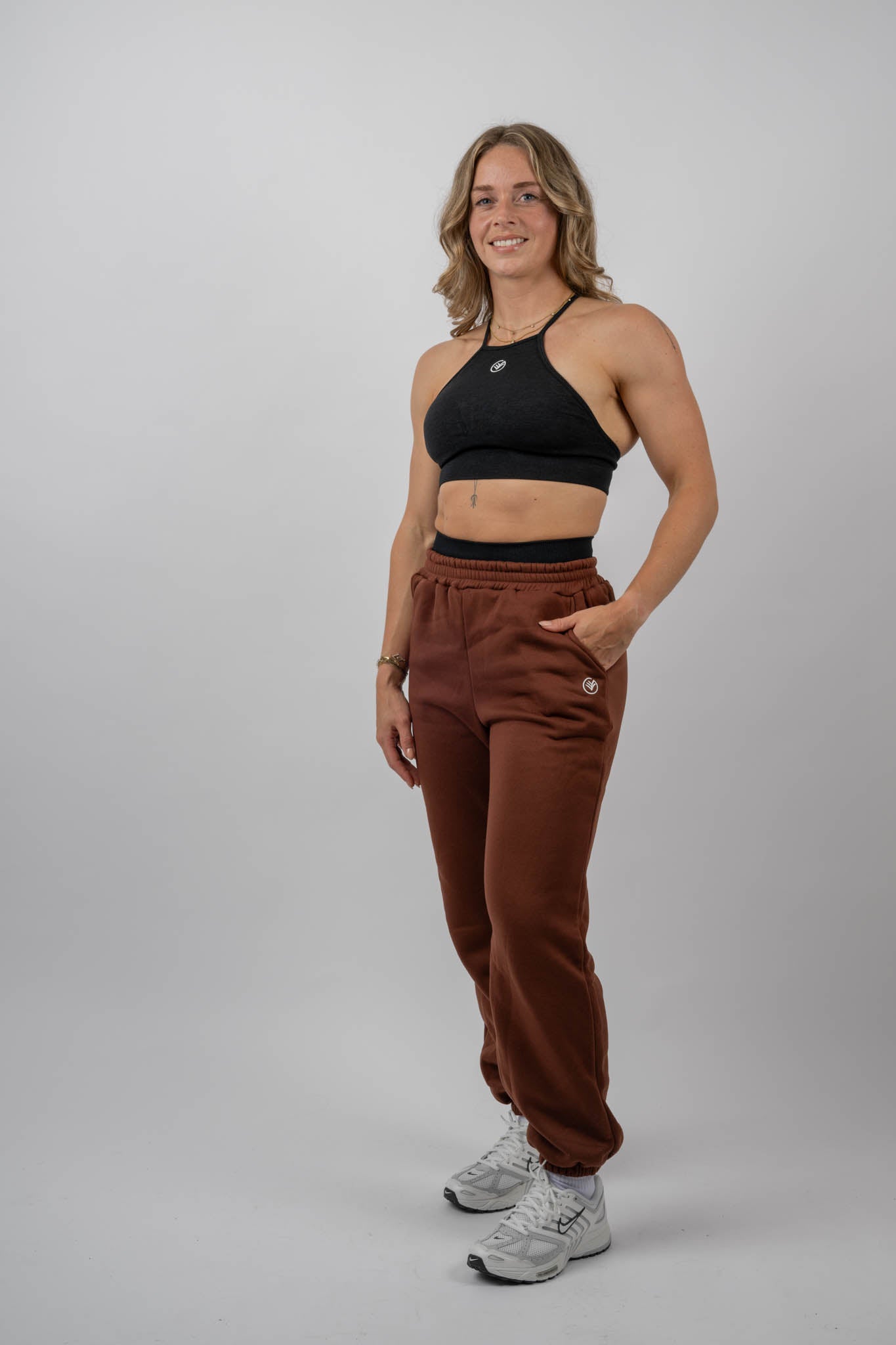Bottoms: Relaxed jogger pants with an elastic waistband and cuffs, featuring side pockets for practicality.