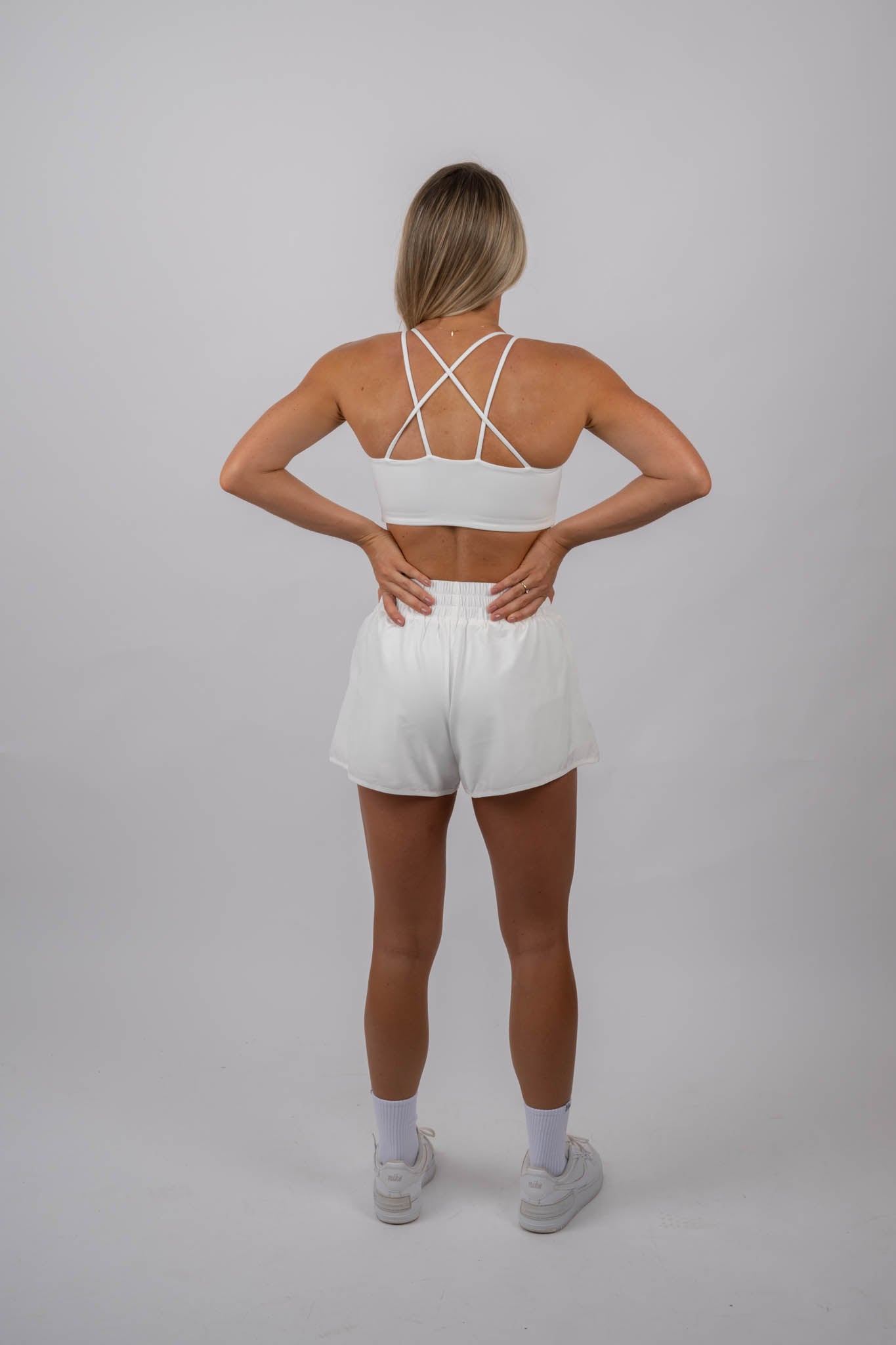 Sports Bra: A supportive, breathable white bra with a flattering cut and adjustable straps, featuring the iconic Galvis Sports logo on the chest. Perfect for high-performance training, padel, tennis, and gym sessions.